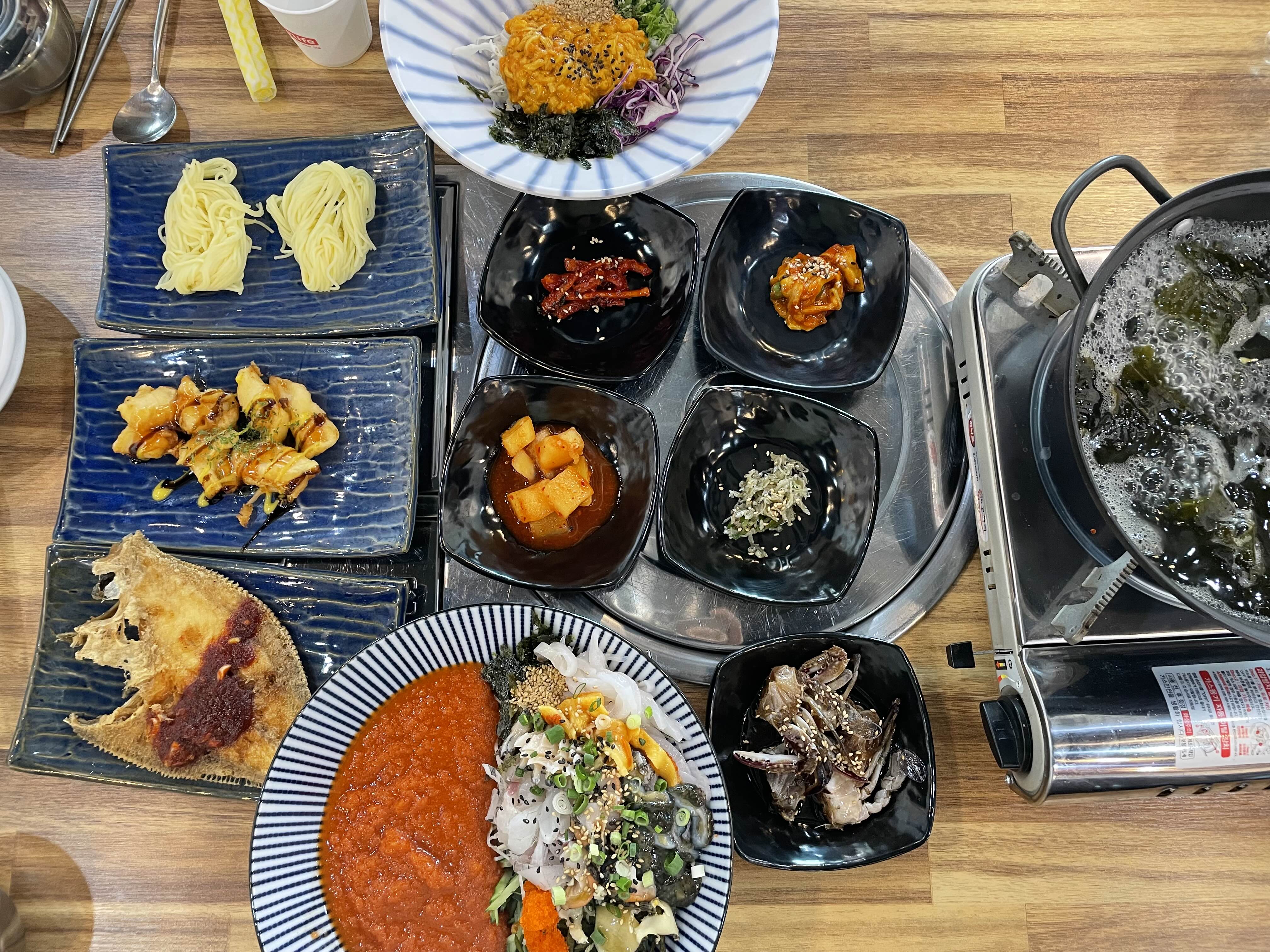 저희가 갔던 곳에서는 멍게 비빔밥과 물회 정식을 주문해서 먹었는데요, 미역국도 서비스로 주시고