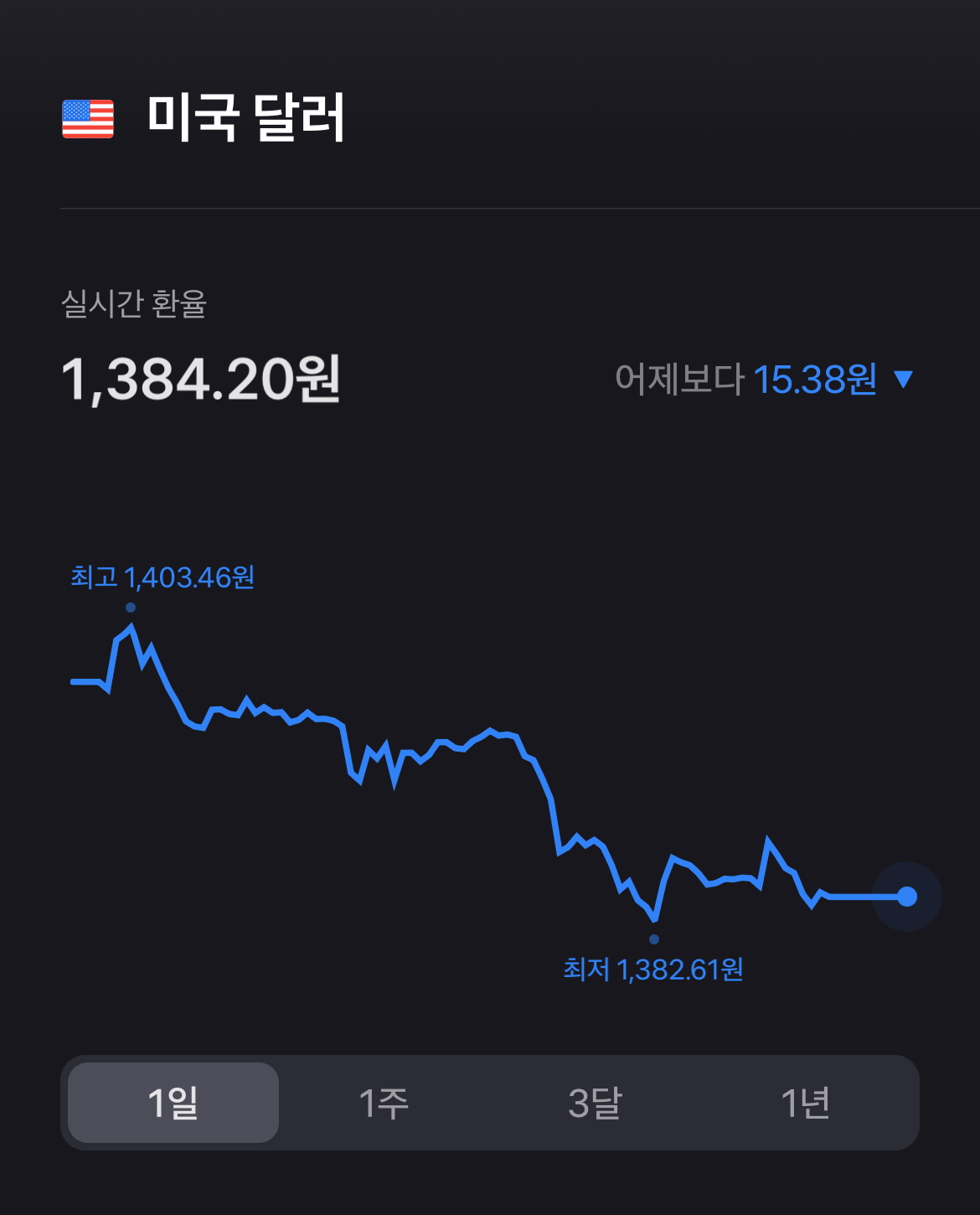 달러의 변동을 1년 주기로 살펴보니 상당히 큰 변화가 있었다는 것을 알 수 있습니다.